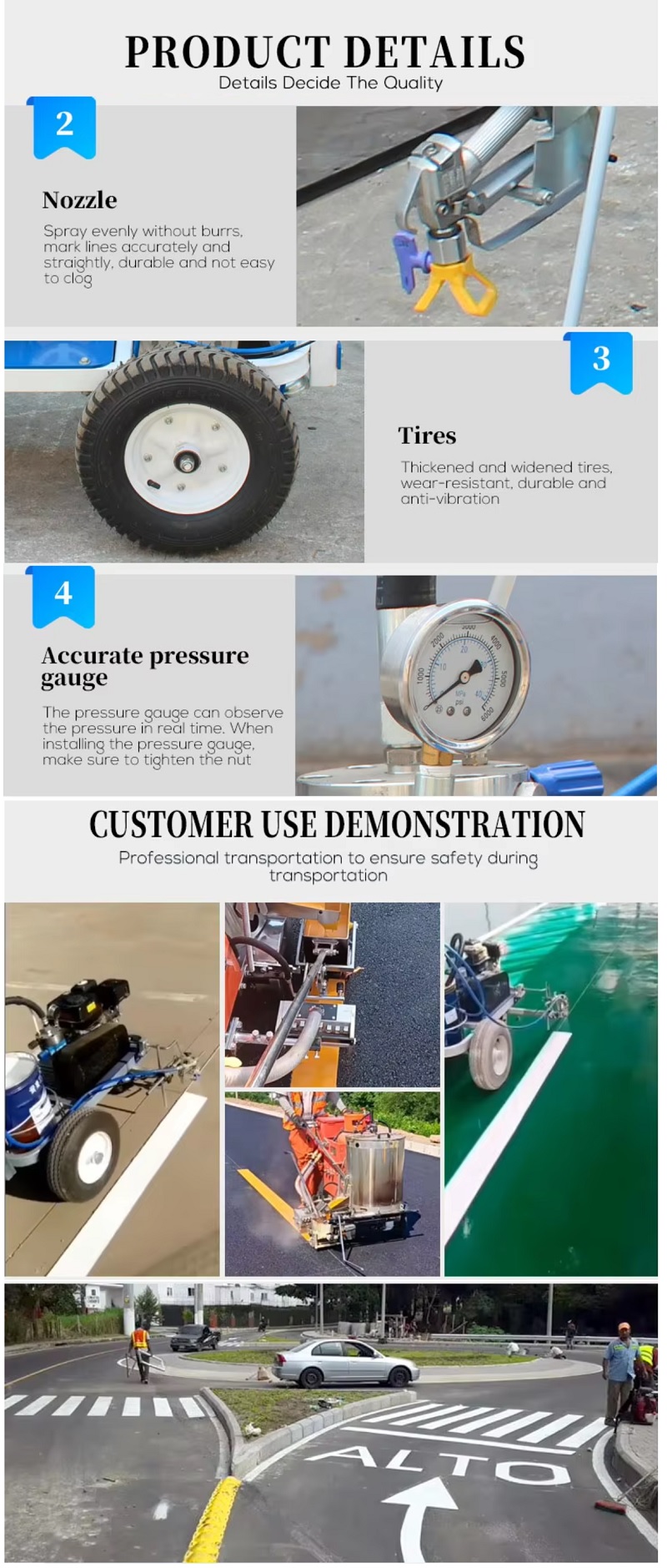 Road marking machine offers several advantages: precision, efficiency, and durability. Its advanced technology ensures accurate and consistent lines, enhancing road safety. The machine’s high-speed operation saves time and labor costs, making it ideal for large projects. Durable construction ensures long-term use with minimal maintenance. It is perfect for highways, city streets, parking lots, and airport runways. Additionally, its adaptability to various paint types, including thermoplastic, makes it versatile for different marking needs. The machine’s user-friendly interface allows for easy operation, ensuring clear and visible markings that meet regulatory standards.