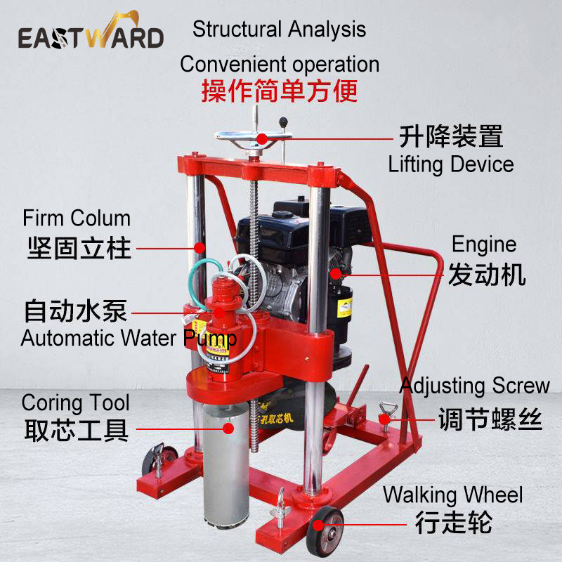 Concrete core drilling machine is easy to start, reliable operation, simple and convenient operation. It is widely used in highway, airport, port, wharf, dam and other necessary testing equipment for concrete and asphalt pavement.It is mainly used for drilling test cores of concrete and asphalt concrete for compression and bending tests.It can also be used for drilling and coring other non-metallic brittle and hard materials, such as refractory, ceramics, glass and rock.