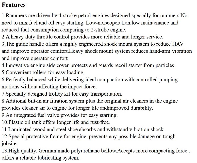 Tamping rammer is widely used in the embankment of the highway, municipal, railway engineering, compaction and maintenance of the slope, and can also be used for bridges, reservoirs, dams engineering foundation compaction ,as well as the construction of trenches, culverts, indoor courtyard and narrow ground . Not only compacted sand, gravel, clay, and also asphalt pavement compaction.