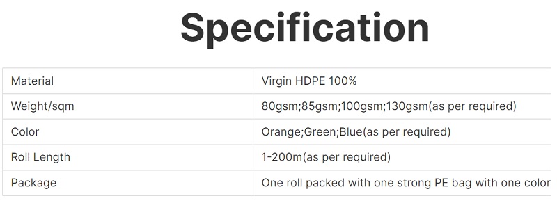 Many different mesh sizes and specifications are available for these products and multiple diverse products can be customized as per customers requirements. The most popular colour of these products is orange. And black colour, green colour or blue colour is also available.